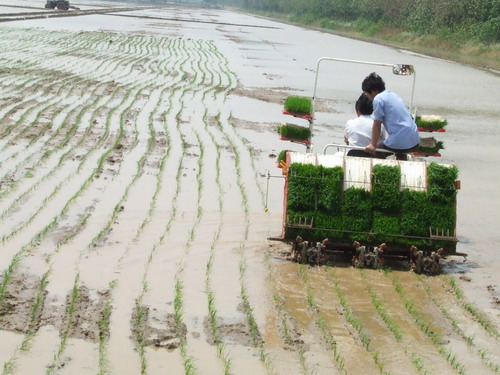 方邱湖农场种子公司大面积推广机插秧走过了育秧、整地阶段,今天正式开始插秧。上午,在有关技术人员的指导下,新购置的乘坐式“洋马”插秧机轻盈地飘行在秧田里,身后留下了一行行葱绿的秧苗。第一家开始插秧的家庭农场职工徐新芳夫妇小心地帮着搬秧运秧,喜悦的心情时不时的从略显紧张的脸上流露出来。据现场的技术人员介绍,如果工作环节协调好,一台插秧机一天可插秧百亩以上,按照这个速度三~四天就可完成全部插秧任务。(邱绪恒)