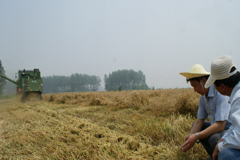 66,大圹圩农场三管区抓住晴好天气,抢收林改田成熟的扬麦22号麦种。一台台装有秸秆粉碎器的收割机在金色麦浪里驰骋,一边卷食麦子,一边粉碎秸秆。通过田间跟踪检查,割茬低、粉碎细、抛散匀,非常有利于秸秆全量还田。